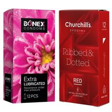 کاندوم چرچیلز مدل Ribbed & Dotted Red بسته 12 عددی به همراه کاندوم بونکس مدل Extra Lubricated بسته 12 عددی