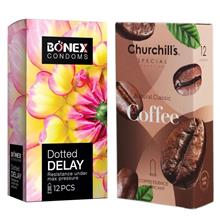 کاندوم چرچیلز مدل coffee بسته 12 عددی به همراه کاندوم بونکس مدل Dotted Delay بسته 12 عددی